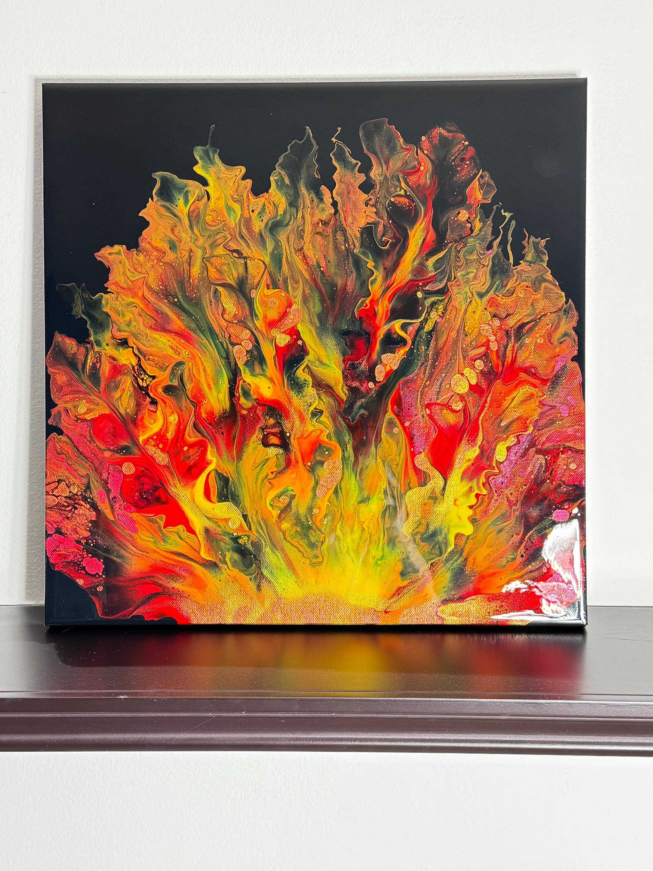 Bold, fiery, and full of movement—Fireside captures the raw energy of flame dancing against a dark backdrop. With vibrant reds, oranges, and yellows erupting like embers from a midnight hearth, this abstract acrylic pour draws the eye and sparks the imagination.