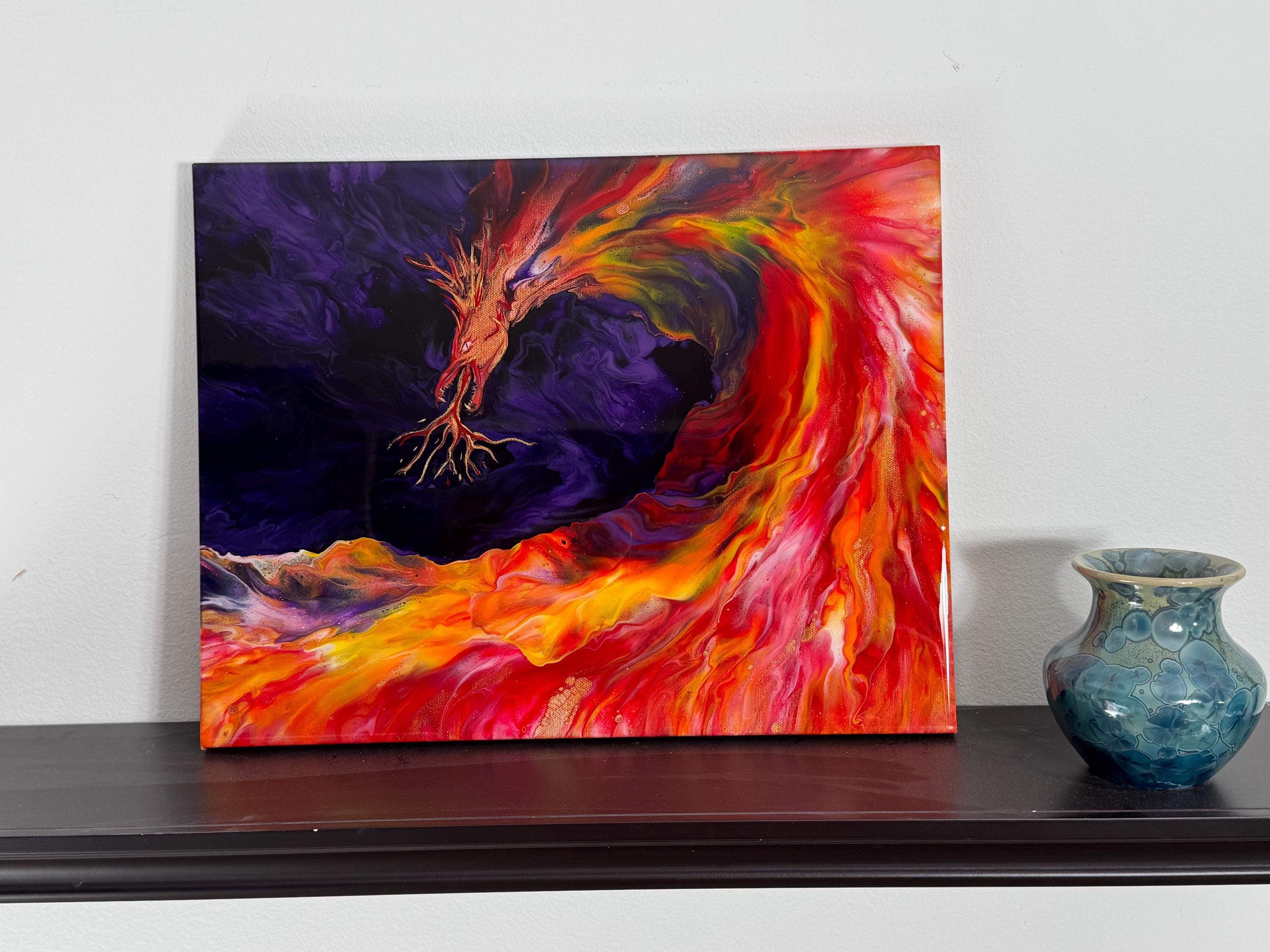 Fiery color and flowing motion collide in Dragon Wave, where a vibrant dragon emerges from a sweeping wave of molten reds, oranges, and golds. This bold, imaginative piece brings the energy of fantasy and the movement of the ocean together in one dramatic statement—perfect for anyone who loves art with power, passion, and a touch of myth.