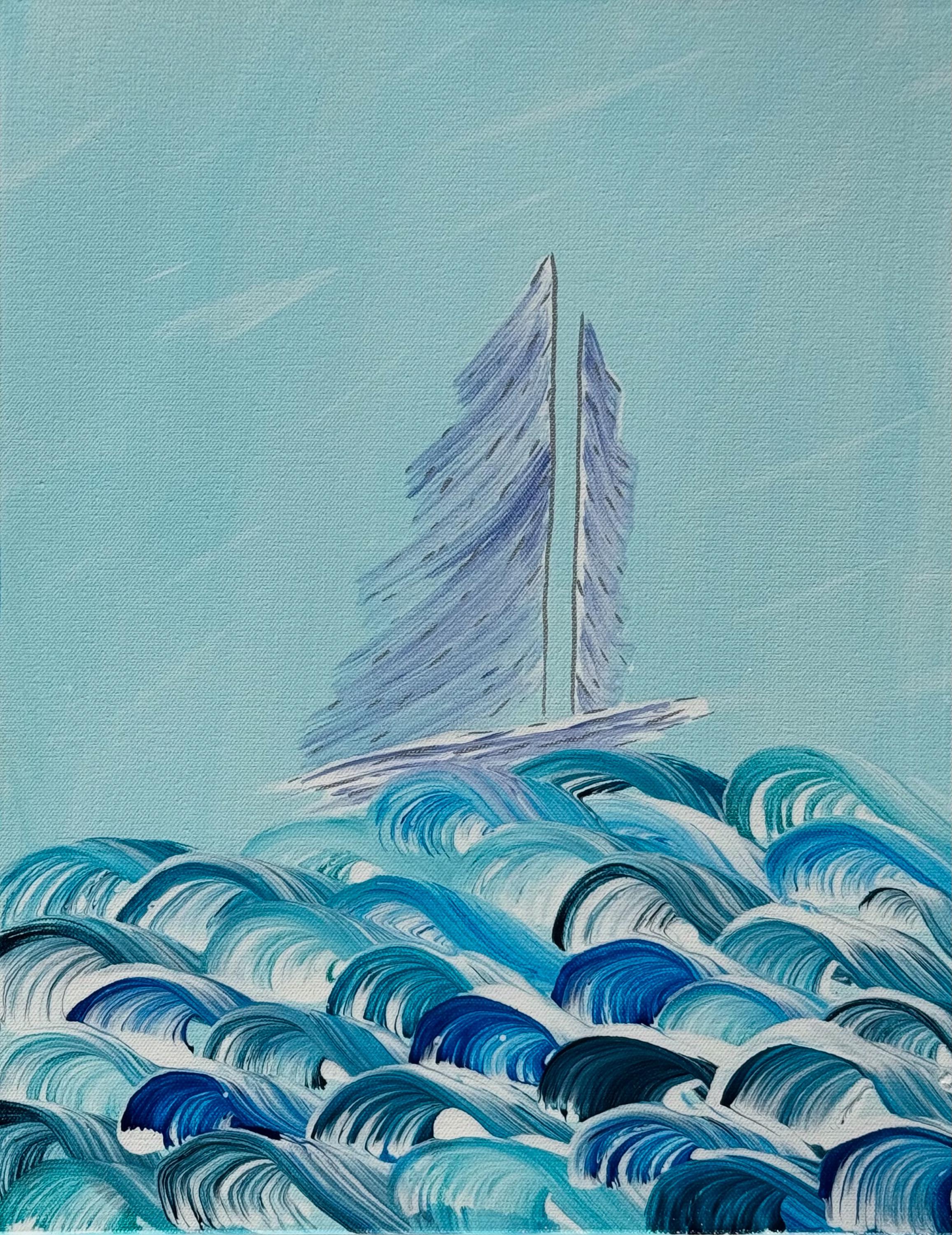 A whimsical sailboat floats on an abstract sea of multi color waves.