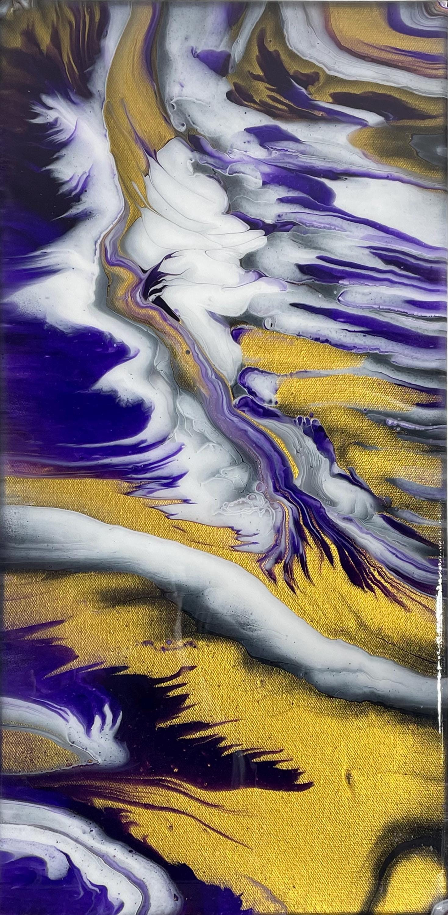 Deep shades of purple, white and gold create a violet cloud across this canvas.