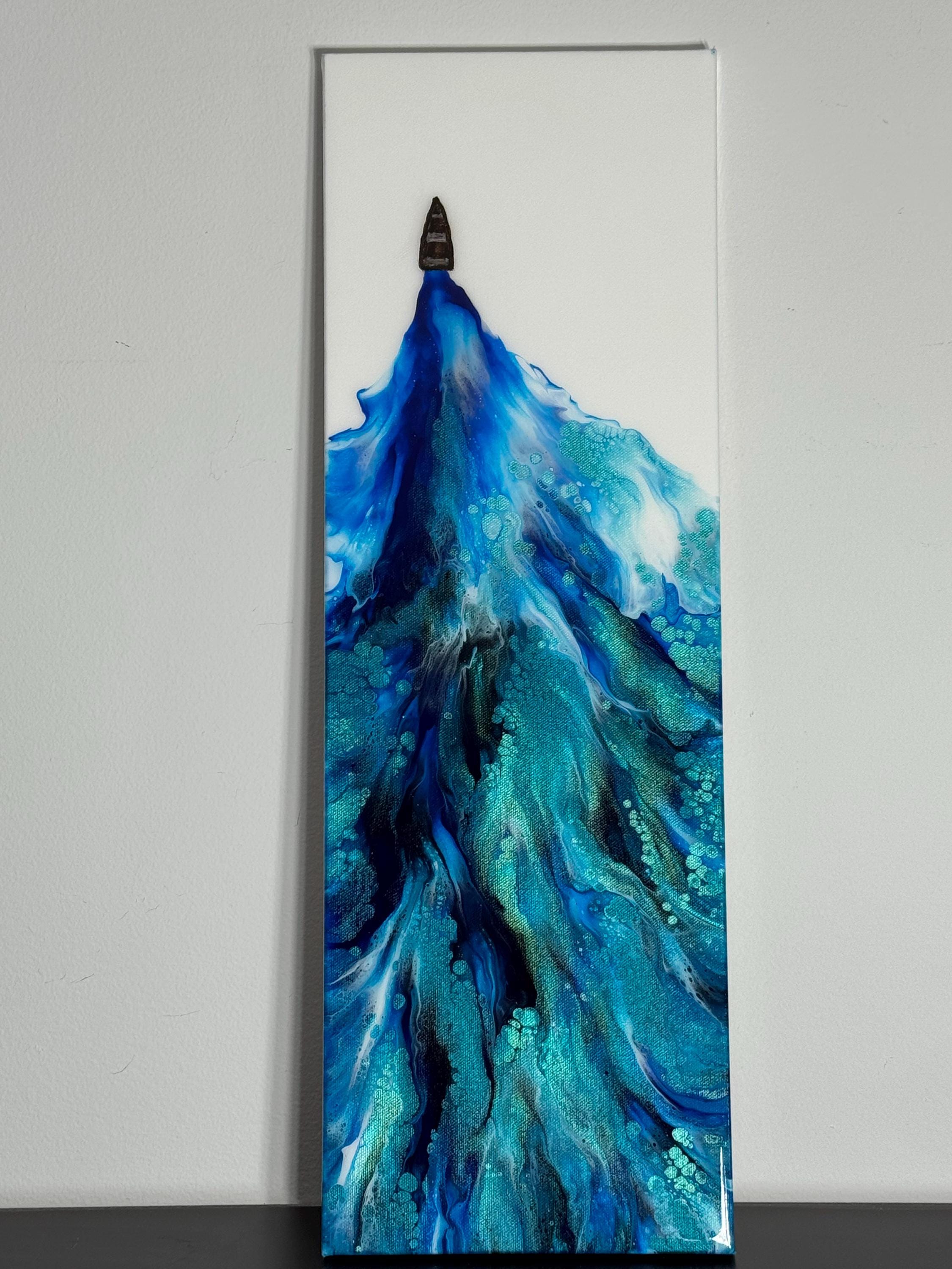 A small boat creates a wake of wonder across this canvas in shimmering blues and greens.